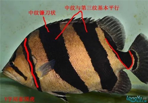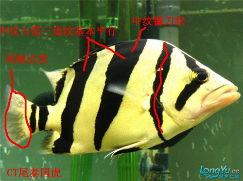 1、 体型:多数的泰虎体型比较宽厚,在水族箱中体长可达60厘米左右。多数是“V”字尾纹的,只有少数的泰虎身体修长多数是“CT尾纹”的,还有“H”尾的,实际上本人觉得体型可以是辨别雌雄的依据之一,其辨别雌雄的方法还有好多,比如鳃盖,体色等,即使辨别出来也没有什么大作用的,在水族箱基本不可能繁殖成功的。